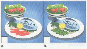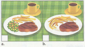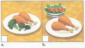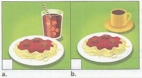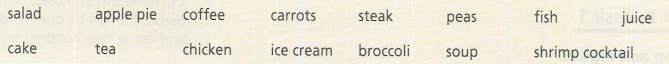 Bài Viết Tổng Hợp BAND 0 – 2.5 – Lesson 13 Getting Ready Write the words below in the chart. Then add one more word to each list. Appetizers: Main dishes: Vegetables: Desserts: Drinks: Listening 1 People are ordering food in a restaurant. Listen and check (√) each person's order. 1. Menu Appetizers Vegetable soup: 4.50 House salad: 3.75 Main Dishes Steak with fries: 18.00 Roast chicken: 9.95 Spaghetti with meat sauce: 11.00 Desserts Apple pie: 3.75 Ice cream: 2.75 Drinks Tea: 1.50 Soda: 1.75 Coffee: 1.50 Juice: 2.00 2. Menu Appetizers Soup of the day: 4.50 Greek salad: 5.00 Main Dishes Vegetable plate: 9.50 Grilled fish with broccoli or peas: 13.00 Desserts Chocolate cake: 3.75 Ice cream: 2.75 Drinks Iced tea: 1.50 Soda: 1.75 Coffee: 1.50 Juice: 2.00 3. Menu Appetizers Chicken soup: 2.75 Spinach salad: 3.50 Main Dishes Beef stir-fry: 5.95 Hamburger with fries: 4.95 Desserts Cheesecake: 3.50 Fresh fruit: 2.75 Drinks Coffee/ Tea: 1.50 Milk: 2.00 Soda: 1.75 Juice: 2.50 Time's up Listening 2 Task 1People are having dinner. What does the server bring them? Listen and check (√) the correct picture. question7036 1. a. b. question7038 2. a. b. question7039 3. a. b. question7040 4. a. b. question7041 5. a. b. question7042 6. a. b. question7043 Task 2Listen again. Was each customer pleased or not pleased with the order? Check (√) the correct answer. question7044 1. Pizza Pleased Not pleased question7045 2. Steak Pleased Not pleased question7046 3. Chicken Pleased Not pleased question7047 4. Vegetable Pleased Not pleased question7048 5. Chocolate cake Pleased Not pleased question7049 6. Spaghetti Pleased Not pleased question7050 Time's up Listening 3 Task 1People are talking about meals they had at a restaurant. Did they like their meals? Listen and check (√) the correct answer. question7051 1.the appetizer Liked Didn't like question7074 the main dish Liked Didn't like question7053 the vegetables Liked Didn't like question7054 the dessert Liked Didn't like question7055 2.the appetizer Liked Didn't like question7056 the main dish Liked Didn't like question7058 the vegetables Liked Didn't like question7059 the dessert Liked Didn't like question7060 3.the appetizer Liked Didn't like question7061 the main dish Liked Didn't like question7062 the vegetables Liked Didn't like question7063 the dessert Liked Didn't like question7064 4.the appetizer Liked Didn't like question7065 the main dish Liked Didn't like question7066 the vegetables Liked Didn't like question7067 the dessert Liked Didn't like question7068 Task 2Listen again. Are these statements true or false? Check (√) the correct answer. question7069 1. The steak was a little tough. True False question7052 2. The cake was delicious. True False question7071 3. The steamed vegetables were perfect. True False question7072 4. The onion soup was too salty. True False question7073 Time's up