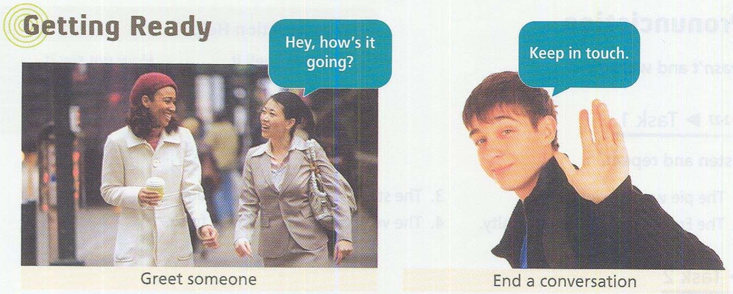 Bài Viết Tổng Hợp BAND 0 – 2.5 – Lesson 14 Getting Ready question7075 Do people use these expressions to greet someone or to end a conversation? Check (√) the correct answer. question7153 1. Keep in touch. Greet someone End a conversation question7097 2. How have you been? Greet someone End a conversation question7098 3. Well, it's been nice talking to you. Greet someone End a conversation question7099 4. How's everything? Greet someone End a conversation question7100 5. Hope to see you again soon. Greet someone End a conversation question7101 6. Well, talk to you later. Greet someone End a conversation question7102 7. Hello. Nice to see you again. Greet someone End a conversation question7103 8. Hey, how's it going? Greet someone End a conversation question7104 9. I haven't seen you for a long time. Greet someone End a conversation question7105 10. It's been great seeing you again. Greet someone End a conversation question7106 Listening 1 question7107 Is each person greeting someone or ending a conversation? Listen and check (√) the correct answer. question7155 1. Greeting someone Ending a conversation question7109 2. Greeting someone Ending a conversation question7110 3. Greeting someone Ending a conversation question7111 4. Greeting someone Ending a conversation question7112 5. Greeting someone Ending a conversation question7113 6. Greeting someone Ending a conversation question7114 7. Greeting someone Ending a conversation question7115 8. Greeting someone Ending a conversation question7116 Time's up Listening 2 question7154 Task 1What are the party guests talking about? Listen and circle the correct answer. question7117 1. a. the guests b. the music c. friends question7119 2. a. a guest b. the music c. Tim question7118 3. a. the music b. a guest c. an old friend question7120 4. a. school b. the woman's health c. work question7121 5. a. a guest b. the party c. the food question7122 6. a. a job b. a vacation c. friends question7123 7. a. the guests b. her new job c. family question7124 8. a. family b. the food c. the guests question7125 Task 2Listen again. Which statement is true? Circle the correct answer. question7126 1. a. The woman is having a good time. b. The woman is not enjoying herself. c. The guests are unfriendly. question7127 2. a. Tim does not recognize the singer. b. Tim does not like the singer. c. Tim likes the singer. question7129 3. a. The man knows the guest. b. The man has not met the guest yet. c. The man does not want to meet the guest. question7131 4. a. The woman does not work now. b. The woman is not busy now. c. The woman is very busy now. question7132 5. a. The man is hungry. b. The man does not want anything to eat. c. The man wants to drink. question7133 6. a. The man took a train across the U.S. b. The man never travels. c. The man recently took a trip. question7134 7. a. The woman's mother is not working now. b. The woman has a jon now. c. The woman's mother has a new job. question7136 8. a. The man knows a lot of people at the party. b. The man does not know a lot of people at the party. c. The man knows everyone at the party. question7137 Time's up Listening 3 question7138 Task 1Two people are talking. Does the second speaker already know the information, or is the information new? Listen and check (√) the correct answer. question7156 1. Already knows the Information New Information question7139 2. Already knows the Information New Information question7140 3. Already knows the Information New Information question7141 4. Already knows the Information New Information question7142 5. Already knows the Information New Information question7143 6. Already knows the Information New Information question7144 Task 2Listen again. Which statement is true? Circle the correct answer. question7145 1. a. Molly has a new job. b. Molly is going to change jobs. c. Molly has just received a big raise. question7148 2. a. The rock concert is next month. b. All the tickets have been sold. c. They don't link rock music. question7149 3. a. The bird was a birthday present. b. She had a bird before. c. She hasn't decided what to call the bird yet. question7150 4. a. Claire will arrive later. b. Claire hasn't been sick this year. c. Claire has the flu. question7151 5. a. He has acted in some movies. b. The guy lives in Canada. c. Both of them have already seen his movies. question7146 6. a. The exhibition starts next month. b. The exhibition is about Walt Disney. c. They are not interested in cartoons. question7152 Time's up