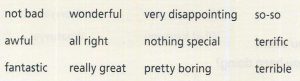 Bài Viết Tổng Hợp BAND 0 – 2.5 – Lesson 15 Getting Ready question7157 When do you use these words? Write them in the correct lists. Then add your own words to each list. question7158 Didn't like it question7164 Liked it a little <span style="color: #ff0000"><strong><img class="alignnone wp-image-7650 size-medium" src="https://learnme.edu.vn/wp-content/uploads/2023/02/Screenshot-2023-02-25-074916-300x81.jpg" alt="" width="300" height="81" /><br /></strong></span> question7179 Liked it a lot Listening 1 question7175 These people didn't have a good vacation. What did they do? Listen and circle the correct answer. question7176 1. a. went away b. stayed home question7177 2. a. went to Hawaii b. went to Okinawa question7178 3. a. went away b. stayed home question7181 4. a. invited relatives to stay b. visited relatives question7182 5. a. went to the beach b. went to the country question7183 6. a. went skiing b. stayed home question7184 7. a. went skiing b. stayed home question7185 8. a. went to Las Vegas b. went to Los Angeles question7186 Time's up Listening 2 question7187 Task 1Did the people enjoy their vacations? Listen and check (√) the correct answer. question7188 1. yes no question7189 2. yes no question7190 3. yes no question7191 4. yes no question7192 5. yes no question7193 6. yes no question7194 7. yes no question7195 8. yes no question7196 Task 2Listen again. What word completes each statement? Write the correct letter. question7198 1. The weather was . 2. The people were . 3. The ski trip was . 4. Their trip to France was very . 5. Her trip to the beach was . 6. The hotel wasn't . 7. The shopping in Thailand was . 8. His vacation was too . Time's up Listening 3 question7208 Task 1People are talking about their vacations. Listen and number the pictures. question7209 A. 1 2 3 4 5 6 question7210 B. 1 2 3 4 5 6 question7211 C. 1 2 3 4 5 6 question7212 D. 1 2 3 4 5 6 question7213 E. 1 2 3 4 5 6 question7214 F. 1 2 3 4 5 6 question7215 Task 2Listen again. Are the statements true or false? Check (√) the correct answer. question7216 1. He learned to water ski very slowly. True False question7217 2. It was cold at night. True False question7218 3. The museums were interesting. True False question7219 4. The weather wasn't good. True False question7220 5. She went to France. True False question7221 6. They had a comfortable trip. True False question7222 Time's up