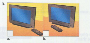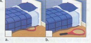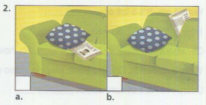 Bài Viết Tổng Hợp BAND 0 – 2.5 – Lesson 9 Getting Ready 1. a plant 2. the skis3. the bed4. the computer5. a book6. the newspaper a. behind the TV b. on the top of the bookcase c. between the bedside tables d. next to the window e. under the table f. on the floor People are asking where items are. Listen and check the correct picture. 1. a b question6609 2. a b question6610 3. a b question6611 4. a b question6613 Time's up Tess is helping Tom decorate his new apartment. Listen and write the number in the location she suggests 1. the magazine rack 2. the coffee table 3. the plant stand 4. the bookshelf 5. the chair 6. the end table 7. the TV 8. the dinner table task 2. Listen again. What do you thinnk each person says next? Choose the correct answer. 1. a. Yes, it is. b. Yes, I agree, it will. c. Yes, it does question6632 2. a. Yes, they are. b. Yes, it can. c. Yes, i think so, too. question6633 3. a. Okay. Try that. b. Of course not c. No, I don't. question6634 4. a. Yes, it will. b. No, the other one. c. Yes, it will look good there question6635 5. a. Yes, I will. b. Yeah. That's right. c. Yes, it does. question6636 6. a. Yes, it can. b. Yes, that's perfect. c. Yes, it does. question6637 7. a. Yes, it will. b. Yes, it does. c. It looks fine question6638 8. a. Yes. That's right. b. Of course it can. c. No, it doesn't question6639 Time's up Tony is helping Meg clean the house.Where should he put the items? Listen and choose the correct answer. 1. the magazines a. on the bookshelf on top of the dictionary b. on the bookshelf next to the dictionary c. in the dictionary question6641 2. the remote control a. beside the TV on the TV program guide b. on top of the Tv next to the TV program guide c. beside the TV program guide in front of the TV question6646 3. the keys a. in a box on top of the desk b. in a box inside a drawer next to a box c. in a box inside one of the desk drawers question6647 4. the baseball cap a. on the hook behind the door b. on the doorknob c. on the floor behind the door question6653 5. the glasses a. inside the case on the coffee table b. on the coffee table next to the papers c. on top of the papers on the coffee table question6654 6 . the belt a. on the sofa in front of the window b. on the floor next to the window c. on the chair next to the window question6658 task 2. Listen again. Are the statements true or false? Check the correct answer. 1. Tony hasn't read the magazines true false question6661 2. The remote control has a new battery true false question6663 3. the keys are for the office true false question6664 4. The baseball cap belongs to Meg's brother true false question6668 5. Meg needs glasses for reading true false question6669 Meg's brother is always very neat true false question6673 Time's up