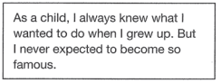 The charity uses celebrities to advertise the work they do. Vicky says, ‘I know some people aren’t sure whether the support of a celebrity is always positive for a charity. They say the celebrities are only doing it to push themselves forward, which prevents the public from seeing the real work of the charity. But if famous singers and actors, for example, can help, I think they should.’