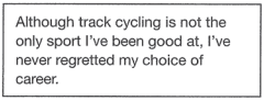 When Vicky Harmiston was a child, her parents gave her and her brother Jamie the freedom to decide what they did in their spare time. Vicky chose to do lots of different sports. She was a good swimmer, and the coach at the swimming club she went to thought she might be good enough to become a champion. But the club was a long way from her home so it was difficult for her to fit in the training around her schooolwork. When they were teenagers, Jamie, who loved cycling, bought himself a special track-racing bike and started taking part in competitions. Vicky thought it looked very exciting and decided to try it for herself. She says that was the best decision she ever made. Soon she was cycling every day and doing really well. The track was near her school, which meant it was no problem for her to attend training sessions after school every day.