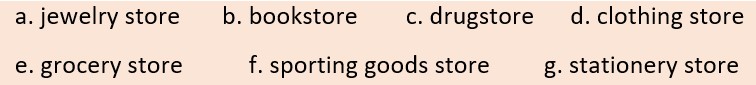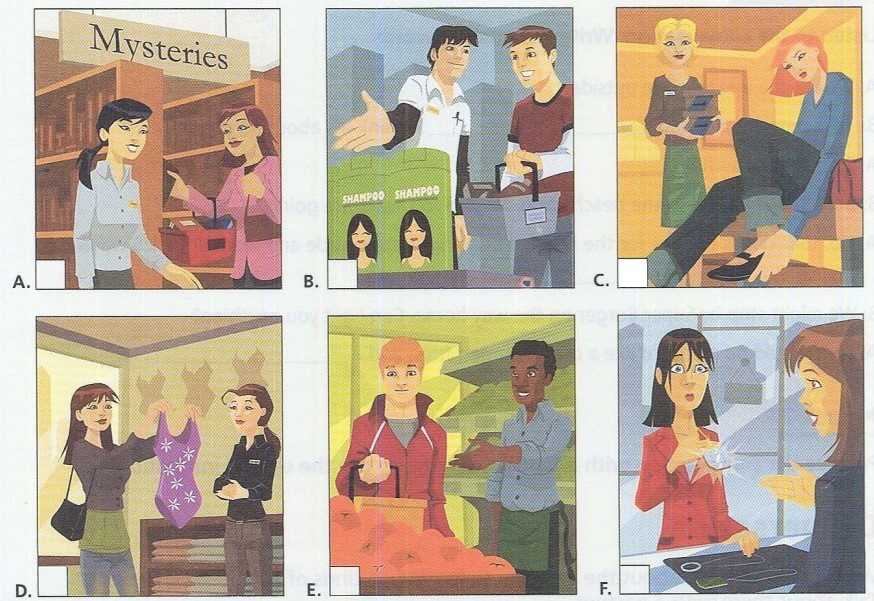 IELTS – 0-2.5 – lesson 19.2 Getting Ready question7376 Match the items on the left with the store where you can buy them on the right. Then write one more item you can buy in each store. question7377 1. running shoes 2. magazines 3. tie 4. necklace 5. vegetables 6. envelopes 7. shampoo Listening 1 question7385 People are shopping. Listen and number the pictures. question7386 A. B. C. D. E. F. Time's up