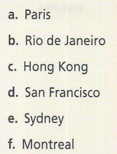 IELTS – 0-2.5 – lesson 23.2 Getting Ready question7608 Match the statements with the correct cities. question7609 1. It's a beautiful city with a very famous beach. Thousands of people attend Carnival here every year. 2. It's a popular city for tourists from all over the world. It is famous for its cable cars. 3. It's a beautiful city on a harbor. It has a famous opera house. 4. It's a noisy city and it's very crowded. People there speak English and Chinese. 5. It's a modern city where people speak both Frech and English. It has very cold winters. 6. It's a romantic city with some beautiful old buildings. It has a very famous tower. Listening 1 question7616 Do the people like the cities they live in? Listen and check (√) the correct answer. question7617 1. Likes it a lot Likes it a little Doesn't like it question7619 2. Likes it a lot Likes it a little Doesn't like it question7620 3. Likes it a lot Likes it a little Doesn't like it question7621 4. Likes it a lot Likes it a little Doesn't like it question7622 5. Likes it a lot Likes it a little Doesn't like it question7623 6. Likes it a lot Likes it a little Doesn't like it question7625 Time's up