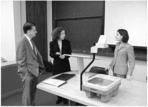The overhead projector is on the table