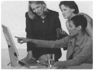 The woman in black suit is standing between the others.